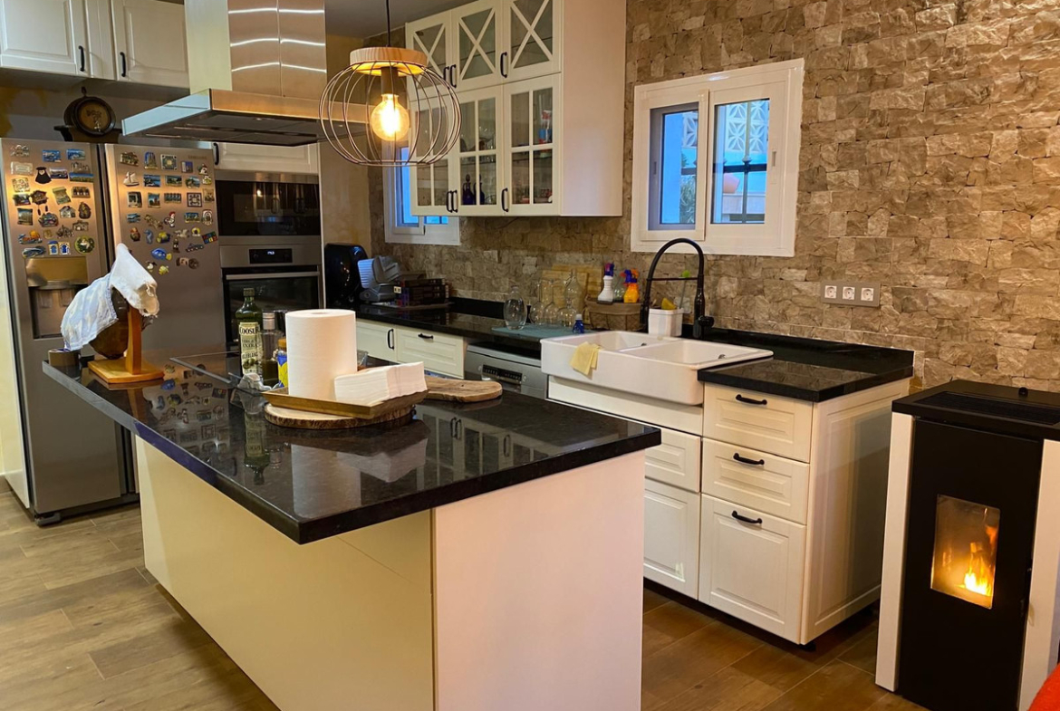 All the bedrooms and the living room of the villa have air conditioning and wardrobes, and the house has photovoltaic panels. On the ground floor, there is a pellet stove.