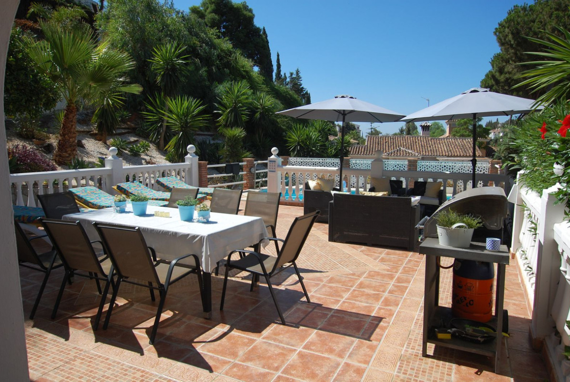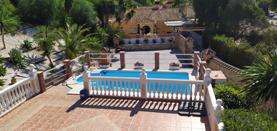 A large villa in a quiet cul de sac in the Urbanisation of Campo Mijas with a large walled and gated garden with ample parking space for 3 or 4 cars . The property is entered via a gated entrance way to the large parking area with easy access to the house. On the upper ground floor there is a pool, barbecue and a sun terrace leading to the entrance hallway, a large open plan living/dining room, second lounge with a fireplace, master bedroom with large shower room, second bedroom with ensuite, large kitchen with separate office/dining area with access to another large sun terrace. The living room also has direct access to themain covered and open terrace, barbecue , bar and pool with open panoramic south west views over the valley . The lower floor is reached via a staircase and has two further bedrooms with access to the lower terrace ,a conservatory, a large shower room and further bedroom with ensuite shower room which has its own private terrace adjacent to the main pedestration entrance . There are ample landscaped gardens for easy maintenance and behind the house there is a large wooden chalet currently used for storage. The property is in a great location and is within easy access to all the amenities of El Coto. There are open panoramic views from the front terraces and pool area, the house is fully air conditioned and will be sold part furnished. The property has an extra bonus of an elevator . solar panels and is suitable for the disabled and eldery as well as a great family or holiday home.
