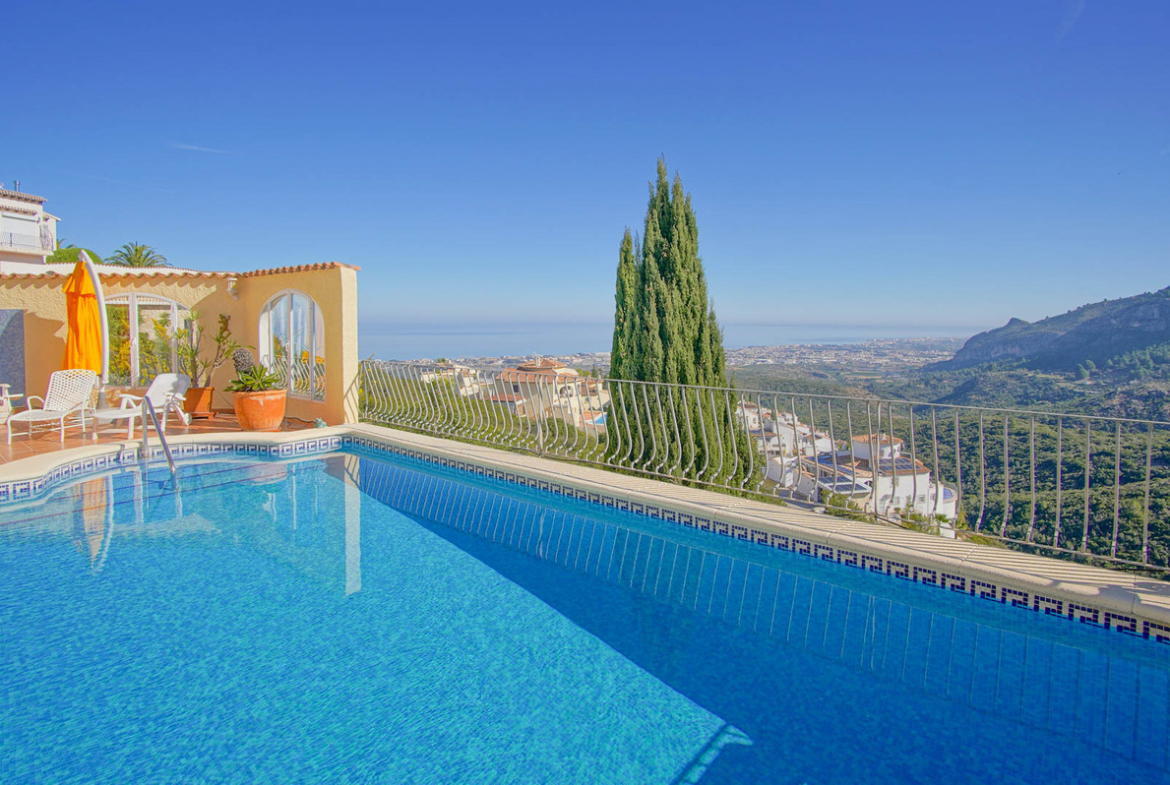 This magnificent villa offers breathtaking views of the Mediterranean Sea and the mountains. Distributed over three floors, the ground floor, at street level, houses the main living area, which has a spacious living room, a fully equipped kitchen with island, 3 bedrooms and a complete bathroom en suite. An external staircase leads to the upper floor, where there is a spacious bedroom with en suite bathroom and a terrace with panoramic views, making this space an ideal place for entertaining, relaxation or even as a work area. The same staircase also leads down to the lower level, where the swimming pool and chill out area are located. Here, there is a laundry area next to a bedroom that is currently empty, offering numerous possibilities as a gymnasium, wine cellar, storage room or whatever other needs you may have.