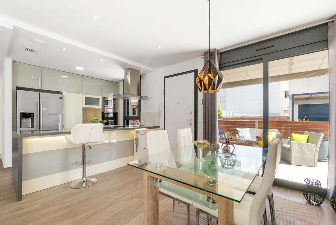 When you enter this elegant home, you will be greeted by an open plan living area, with an impressive living room with large windows, an open plan kitchen that is also fully equipped and with generous storage space.