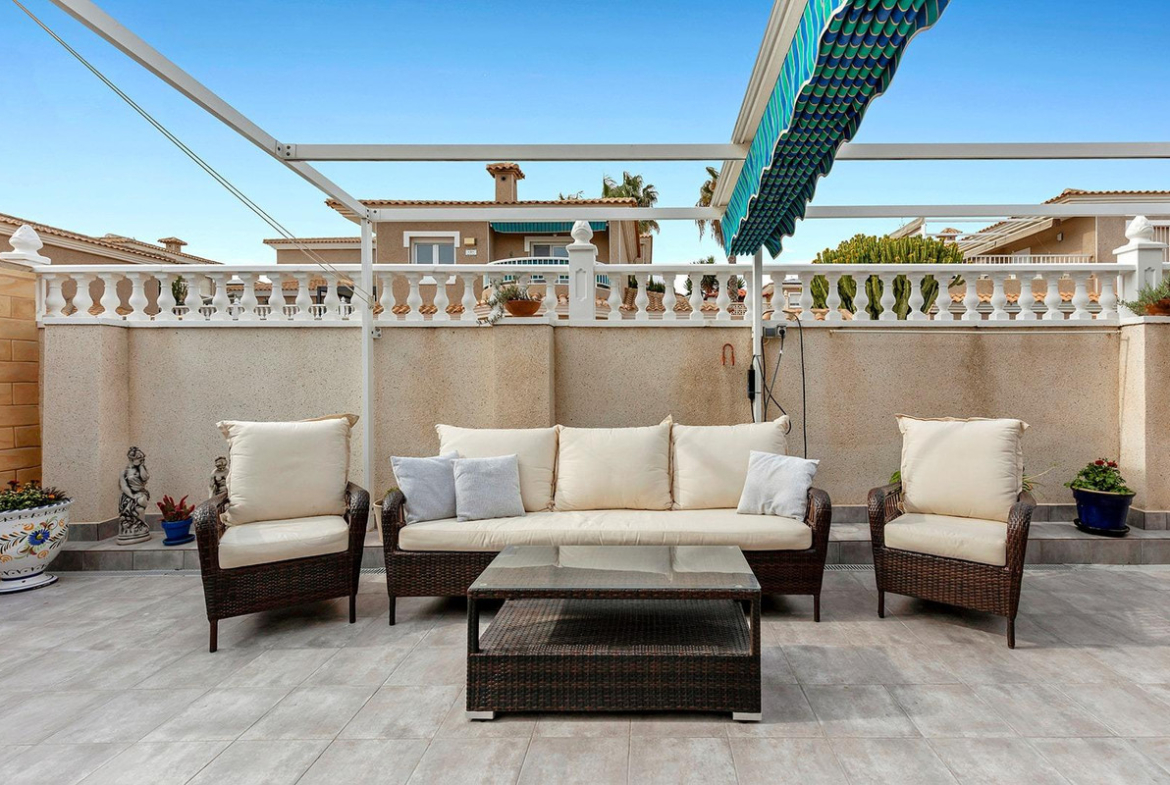 Exclusive independent Mediterranean-style villa with sea views and private pool in Los Altos, Torrevieja~~Discover this magnificent independent villa in one of the most sought-after areas of Torrevieja. With an elegant Mediterranean-style design, this property offers the perfect balance of comfort, privacy, and proximity to all services.~~5 bedrooms | 3 bathrooms | 131 m² built | 330 m² plot~~Prime location: Located in the quiet urbanization of Los Altos, just a few minutes from the beaches of Punta Prima and with easy access to schools, supermarkets, restaurants, and shopping centers like La Zenia Boulevard and Habaneras.~~Home distribution:~✔ Ground floor:~Bright living room with access to terraces and relaxation areas.~Fully equipped independent kitchen with laundry area.~1 bedroom and 1 bathroom with shower.~Beautiful porch and gardens.~~✔ Upper floor:~2 bedrooms.~1 full bathroom with bathtub.~Terrace with clear views.~~✔ Semi-basement:~2 additional bedrooms, perfect for guests.~Leisure area.~1 full bathroom with bathtub.~Storage room.~Tool area.~~On this floor, there is direct access to the spectacular private saltwater pool and a cozy terrace with a fireplace.~~???? You will love:~✅ The private saltwater pool.~✅ Several terraces to enjoy the sun and outdoors.~✅ Urbanization with communal pool.~✅ Sold fully furnished.~✅ Excellent communication with the AP-7 and N-332, facilitating access to Torrevieja, La Zenia, and Alicante airport.~~A unique property, ideal both as a permanent residence and for enjoying an unforgettable vacation on the Costa Blanca. ~Don't miss this opportunity! Contact us for more information or to schedule a visit.~~Taxes and fees not included in the price.