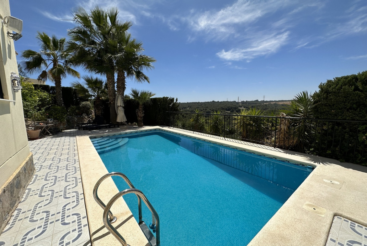 Immaculate villa for sale located with elevated, front-line views located at Las Ramblas golf resort. This impressive south facing property was designed so that every room boasts spectacular views across the golf course and pine forrest. On the main level of the property is a huge living room with seperate television and dining areas along with a guest toilet. There is an impressive fully equipped kitchen with vaulted ceiling and a staircase leading to an additional chill out area and a private office. From the living room there is access to a very sunny terrace, purpose built bbq and outdoor dining area with again more breathtaking views of the golf course. An internal staircase leads down to the master bedroom which had a private sun terrace, dressing room and double bathroom with a shower and bathtub. There are two additional guest bedrooms and a guest bathroom. The property also has a second lounge and living area with kitchen, bathroom and even a cocktail bar with direct access to the swimming pool and sunbathing deck. The property has been finished to a high quality and finished with many, many extras including private garage, air-conditioning, two fireplaces, mosquito nets, electric gates and alarm system.