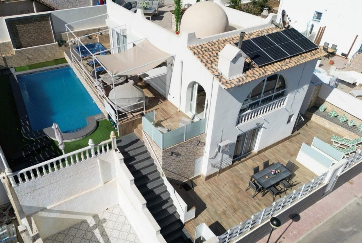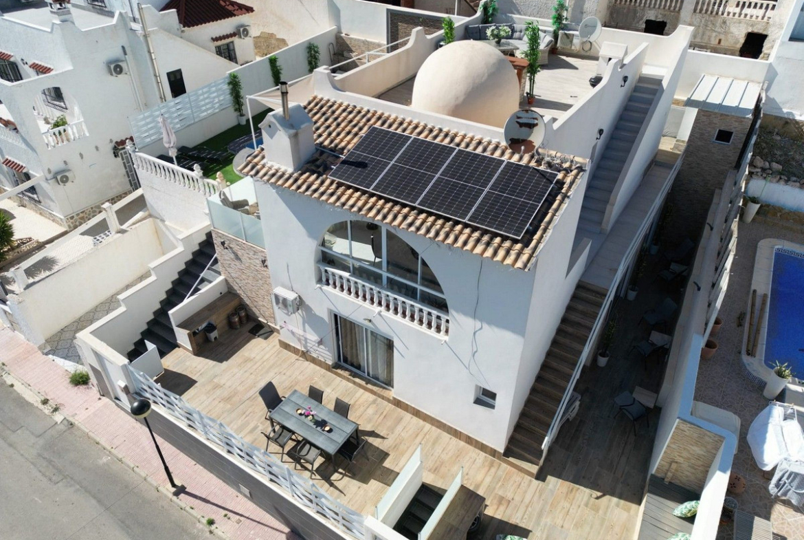 This very impressive 5 bedroom Detached Villa is situated in a quiet location in Blue Lagoon, Villamartin. The property has been distributed over 2 levels with the lower level offering 3 apartments, each offering a bedroom, bathroom, living area, and kitchen. the upper floor consists of