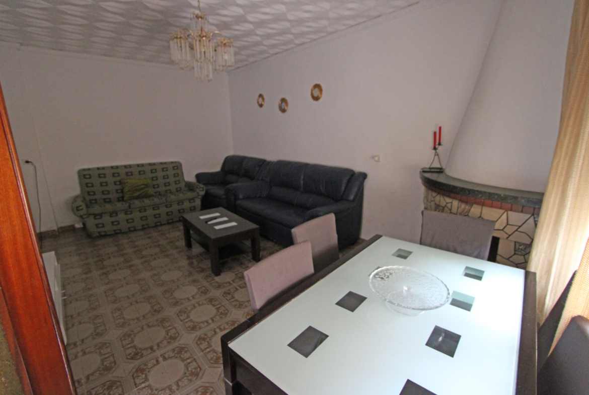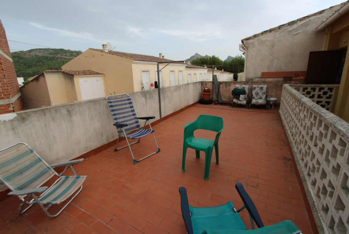 Village house with garage for sale in Sagra. The house is located in a very quiet area. The ground floor is distributed into a living-dining room, an independent kitchen, a laundry room, 2 bedrooms, and a toilet. The upper floor consists of a terrace, 3 bedrooms, and a bathroom. The property is very close to all services such as supermarket and restaurants. The nearest beaches are 15 minutes away. The largest shopping center in the area is in Ondara, less than a 15-minute drive, as well as the highway to Valencia (1h) and Alicante (1h).