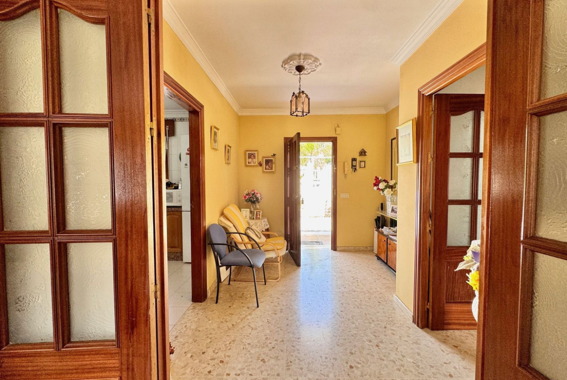 The main entrance is through an automatic gate. On the left, you’ll find the garage, covered parking, and storage room. Directly ahead is the entrance to the main apartment, and to the right, the pool area.
