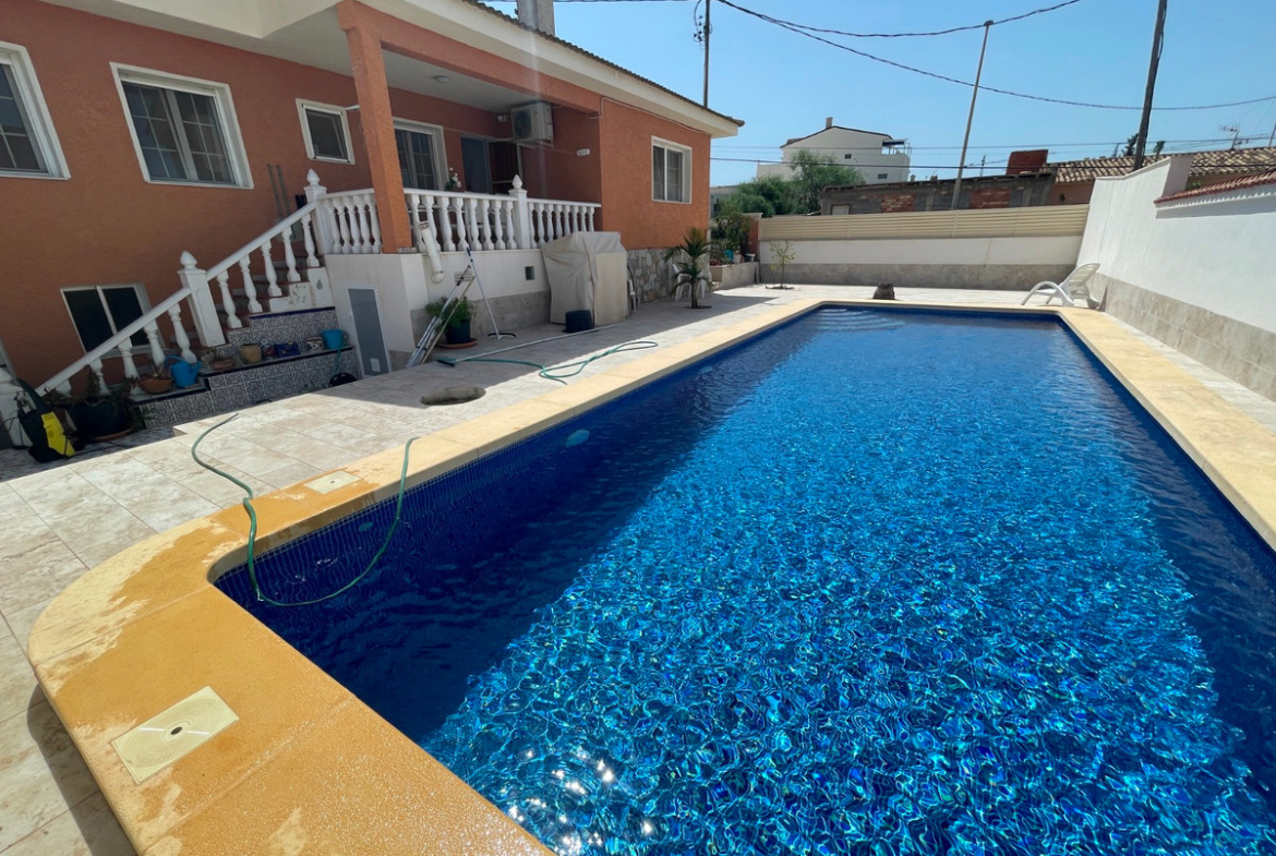 Detached villa in the heart of BenijófarWant to live in the centre but feel like you're in your own private paradise? This detached villa has it all.On the ground floor, you'll find 4 bedrooms, a kitchen, a large living-dining room where even your mother-in-law will feel at home, and 2 bathrooms so that morning queues become a thing of the past. The terrace by the pool is perfect for endless breakfasts, spontaneous barbecues, or family meals that stretch until dinner time.In the basement, the story continues: garage, another kitchen (for the hidden chef in the family), bathroom, and space to create 2 extra bedrooms if needed. Plus, direct access to the pool – which, by the way, is less than 3 years old.Corner property. Fully legal. Climalit double-glazed windows with mosquito screens throughout, so the bugs will have to admire from outside.Don't think too long – homes like this in the centre of Benijófar don't last. Come and see it before someone else takes the first dip in your future pool.