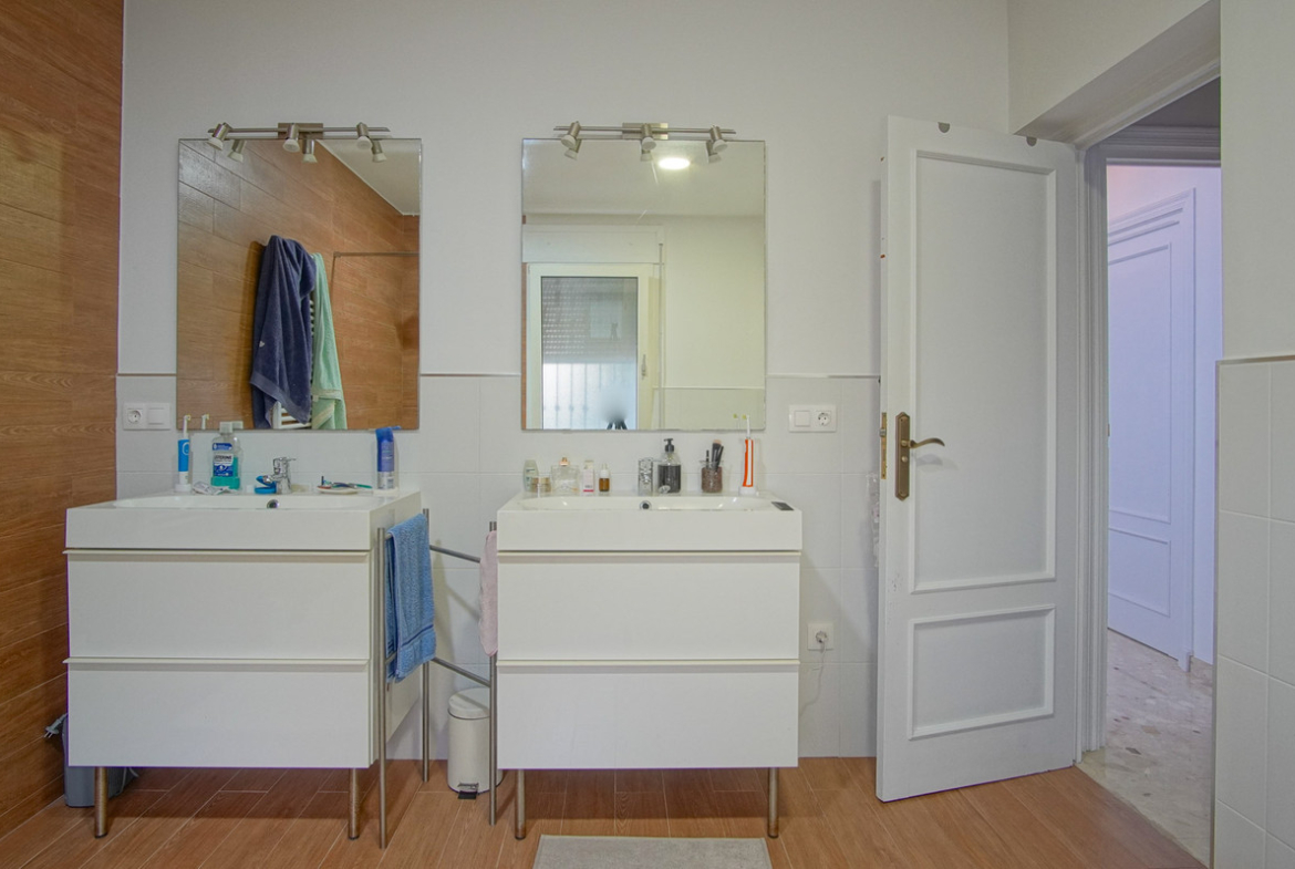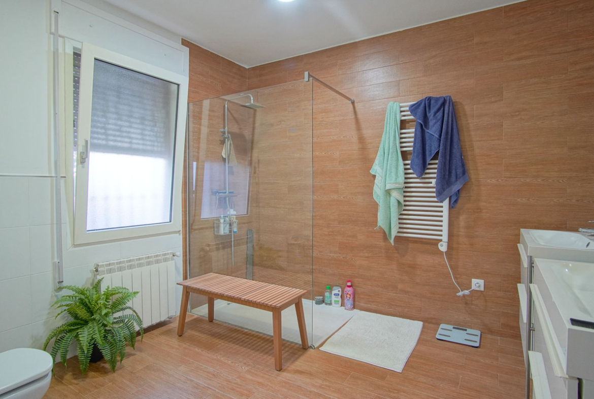 The ground floor is accessed via a terrace. Here we find the heart of the house, with a spacious living room with fireplace, a separate dining room and a large separate kitchen. Also on this floor are three double bedrooms with fitted wardrobes and a full bathroom. The large windows and sliding doors let in plenty of natural light, creating a warm and welcoming atmosphere.
