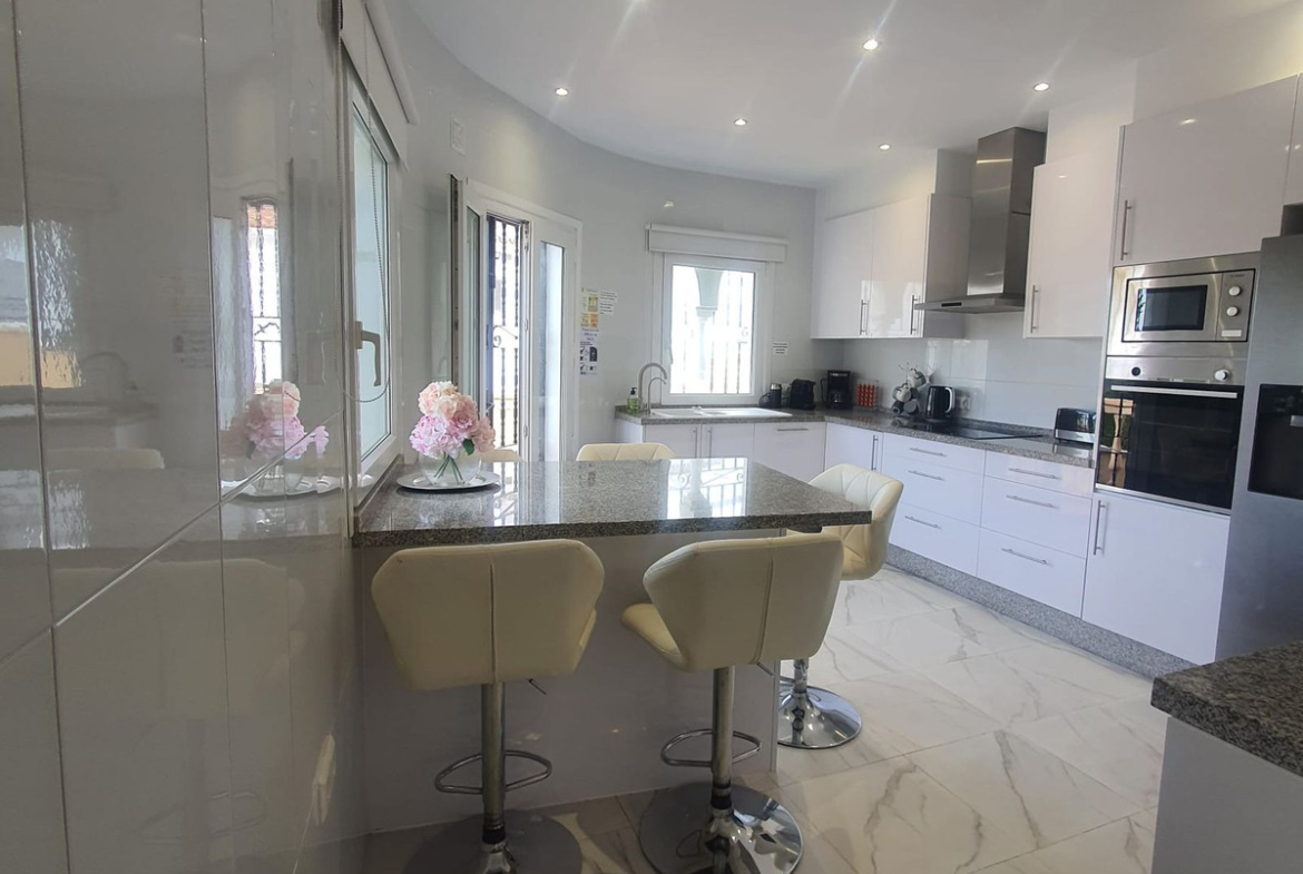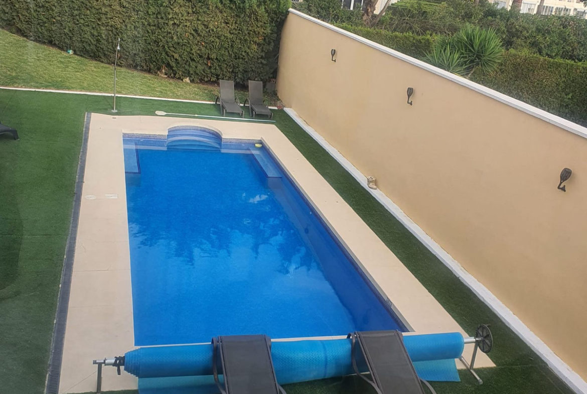 Fantastic returns from this large Villa which has a tourist license and a successful holiday rental business. Own a spacious six bedroom villa in a sought after urbanization close to beaches, a children's play area and shops and restaurants of Playa Marina. It features a large swimming pool, ample outdoor spaces with a well-established garden and low maintenance artificial grass. The main living area opens onto a covered terrace with glass curtains for year-round enjoyment and views of the pool. Inside, there are two open kitchen areas and a large roof terrace to enjoy the sun all day long.