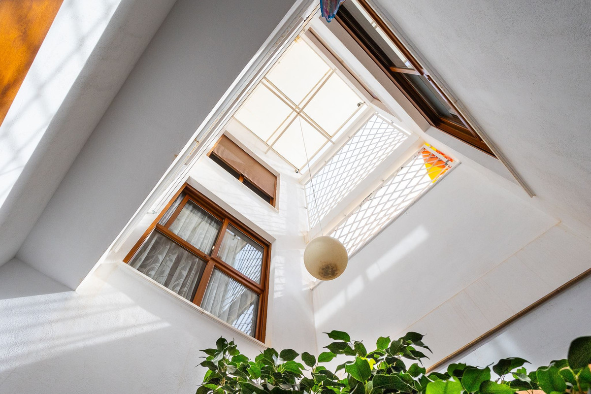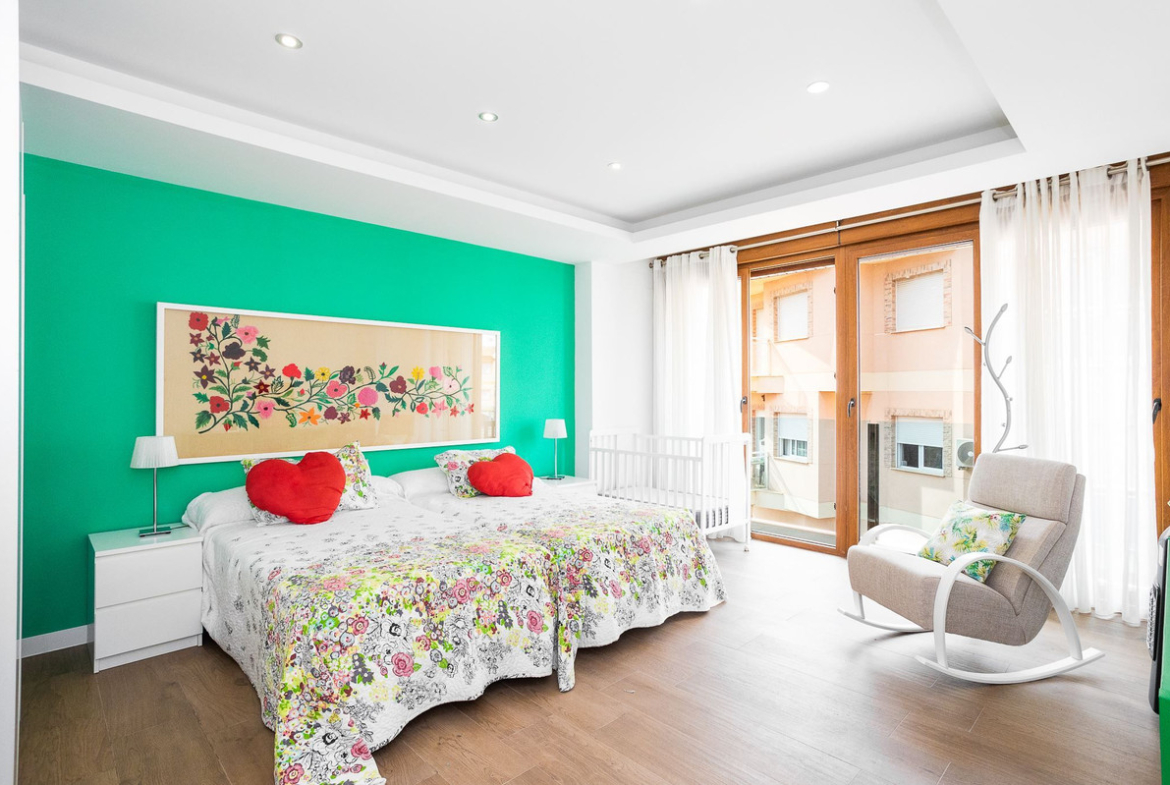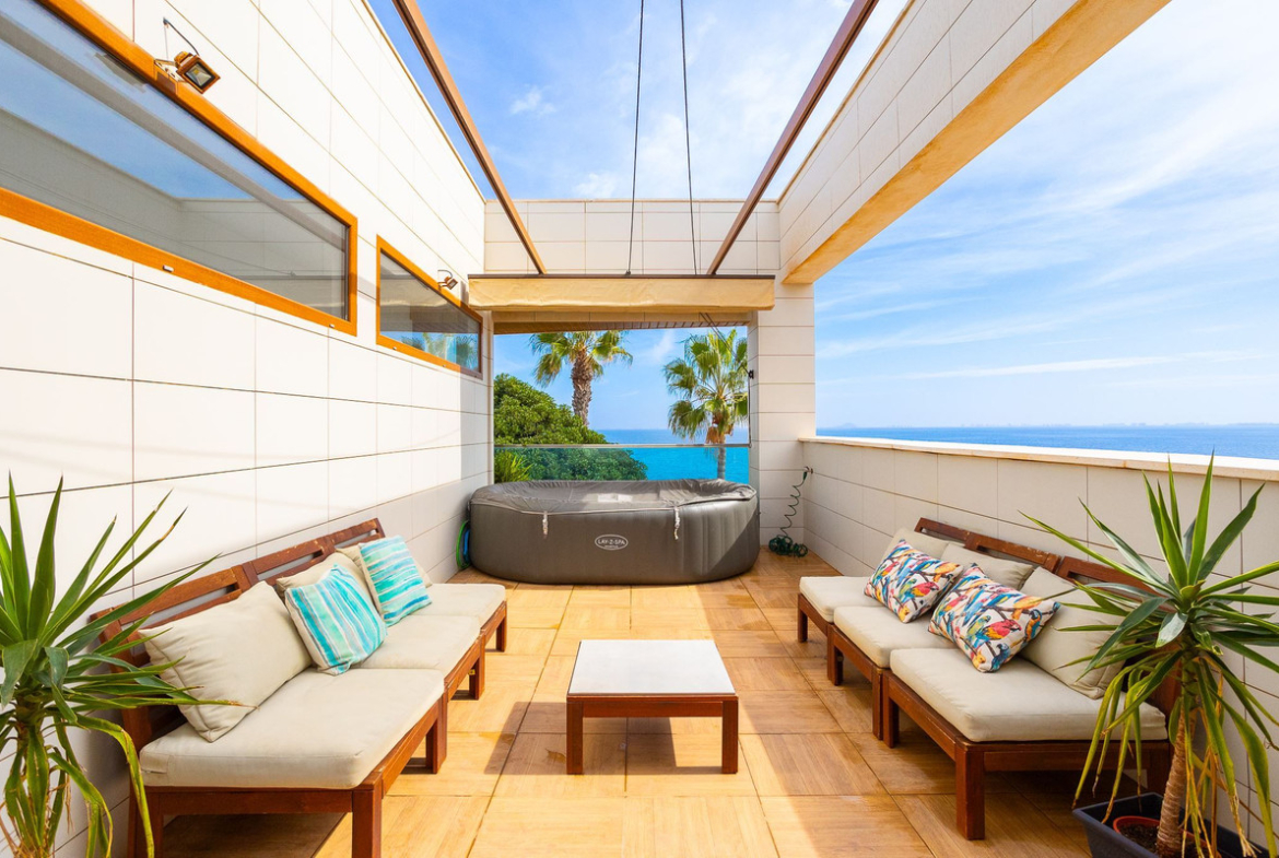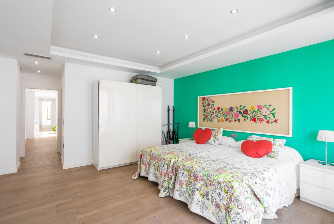 This modern villa here is about 509 square meters and has seven bedrooms, seven bathrooms, living room and kitchen. Added to this is a large terrace and a nice balcony, both with unbeatable views.