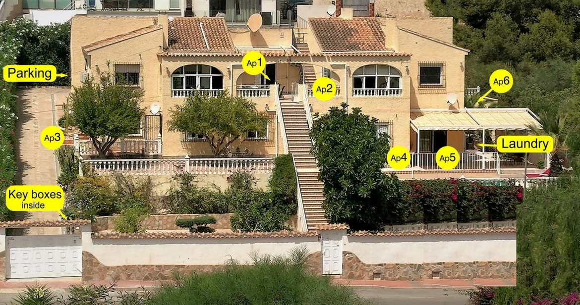 We present to you this great opportunity with amazing investment. This amazing property offers a total of 7 apartments all equipped with living area, kitchen, bedroom and bathroom / full capacity for up to 23 people, and the Main house offering living/dining area, bedroom and bathroom. The property is surrounded by palm trees, flowers, fruit trees, aromatic herbs, with all the comforts you need to relax. Large terraced areas with a communal swimming pool, air conditioning, private parking and sold furnished. The property is overlooking a beautiful park and sports areas to play and only 5 minute walk from a shopping center with restaurants, bars, supermarket, shops.