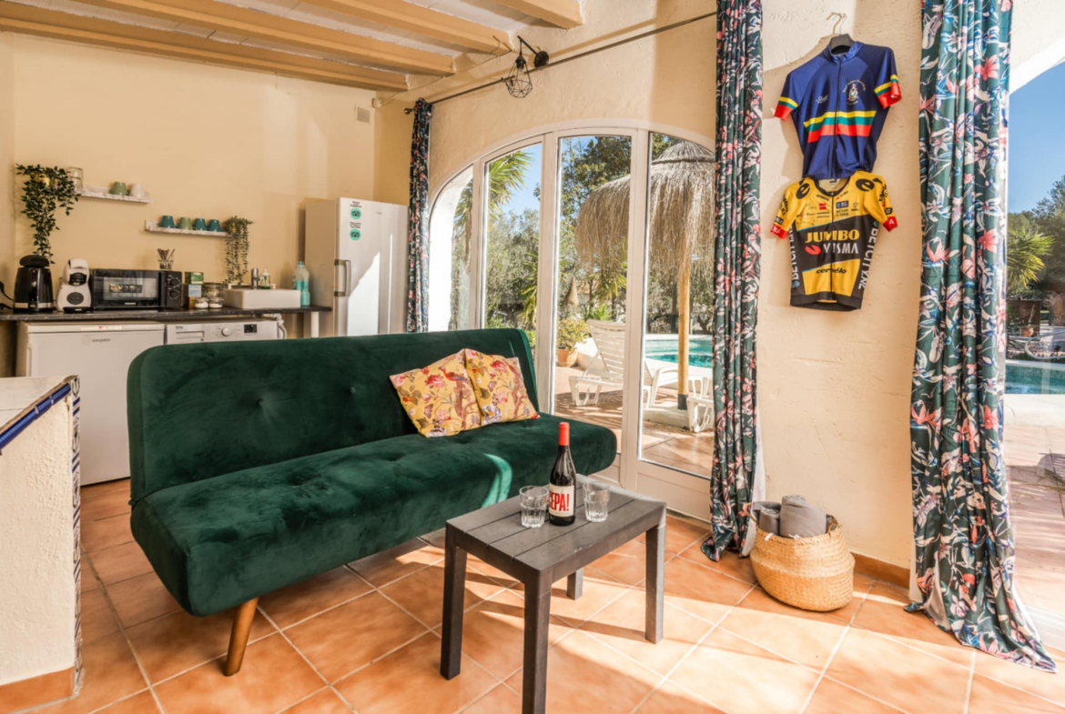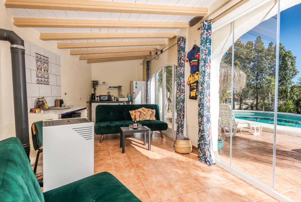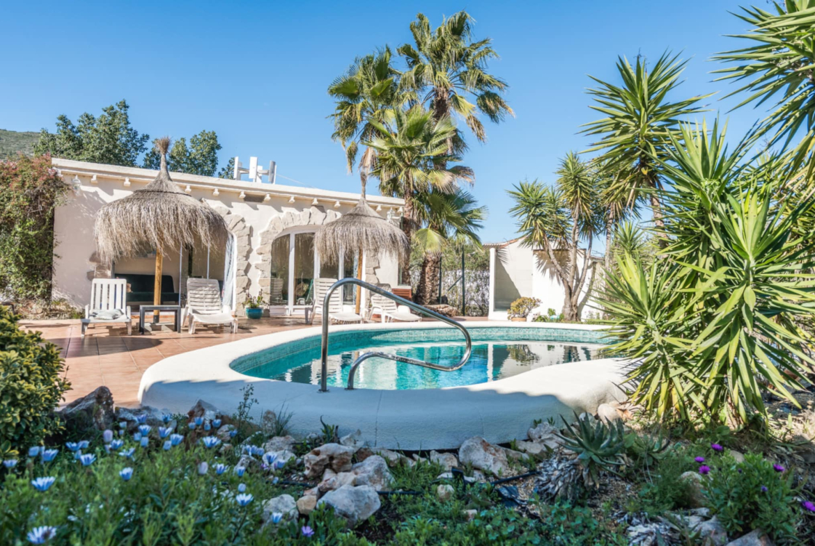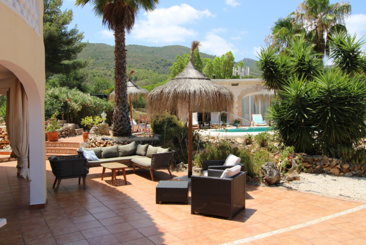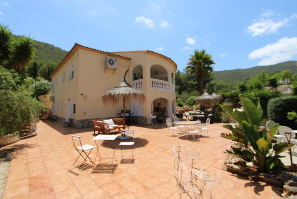This is a rare opportunity to buy a beautiful 9 bedroom villa in the Spanish countryside in a beautiful location which has already been running as an existing bed and breakfast property and has a number of years of existing business history. The villa is set on a large plot not far from the village of Jalon. There are 2 separate entrances with parking for 15 or 20 vehicles plus a garage for 1 car. The main car parking area leads to a large open terrace with a variety of chairs and tables. On the left is the main house which consists of the owners private accommodation upstairs with 2 bedrooms and below 3 separate 2 bedroom apartments. On the right is a small 1 bedroom casetta. All the bathrooms in the main building have underfloor heating. The casetta has underfloor heating throughout but not in the shower room. There is central heating, hot and cold A/C and a wood burning estufa in the lounge of the main house. The 3 apartments in the main building are all individual living areas. The 1st has 2 bedrooms, a separate kitchen and shower room. The apartment has central heating. The 2nd also has 2 bedrooms a small kitchen and shower room. There is an A/C unit the 3rd apartment has 2 bedrooms one exceptionally large. There is an ensuite shower room plus a family shower room, This has C/H and ab A/C unit. This 3rd apartment leads onto a large covered terrace which is used for outside dining and leads to the pool and a very large terrace with shower. There is a lovely casetta on the far side of the terrace which is used as a lounge area for guests and has some kitchen facilities. To the rear of this casetta is a fully fitted summer kitchen with ample seating areas. The upper level of the main villa is at present used as the living area for the owners and consists of a large lounge with a wood burning stove and A/C, an arch leads to the dining room and a large fully fitted kitchen with separate utility room. There are 2 bedrooms, a large master with ensuite bathroom and a 2nd bedroom. Both have A/C units. There is also a family shower room. From the lounge patio doors lead onto a large covered porch with panoramic views across the Jalon valley. The villa has a number of different seating areas around it plus some additional storage rooms. The village of Jalon is only a couple of minutes drive whilst coastal areas such as Moraira or Calpe are only a short drive away. This property is already being run very successfully as a Bed and Breakfast business and is ideal for anyone wishing to carry on doing so. Alternatively it would make a perfect large family home. The villa and its location are idyllic and an early viewing is recommended to fully appreciate this superb property